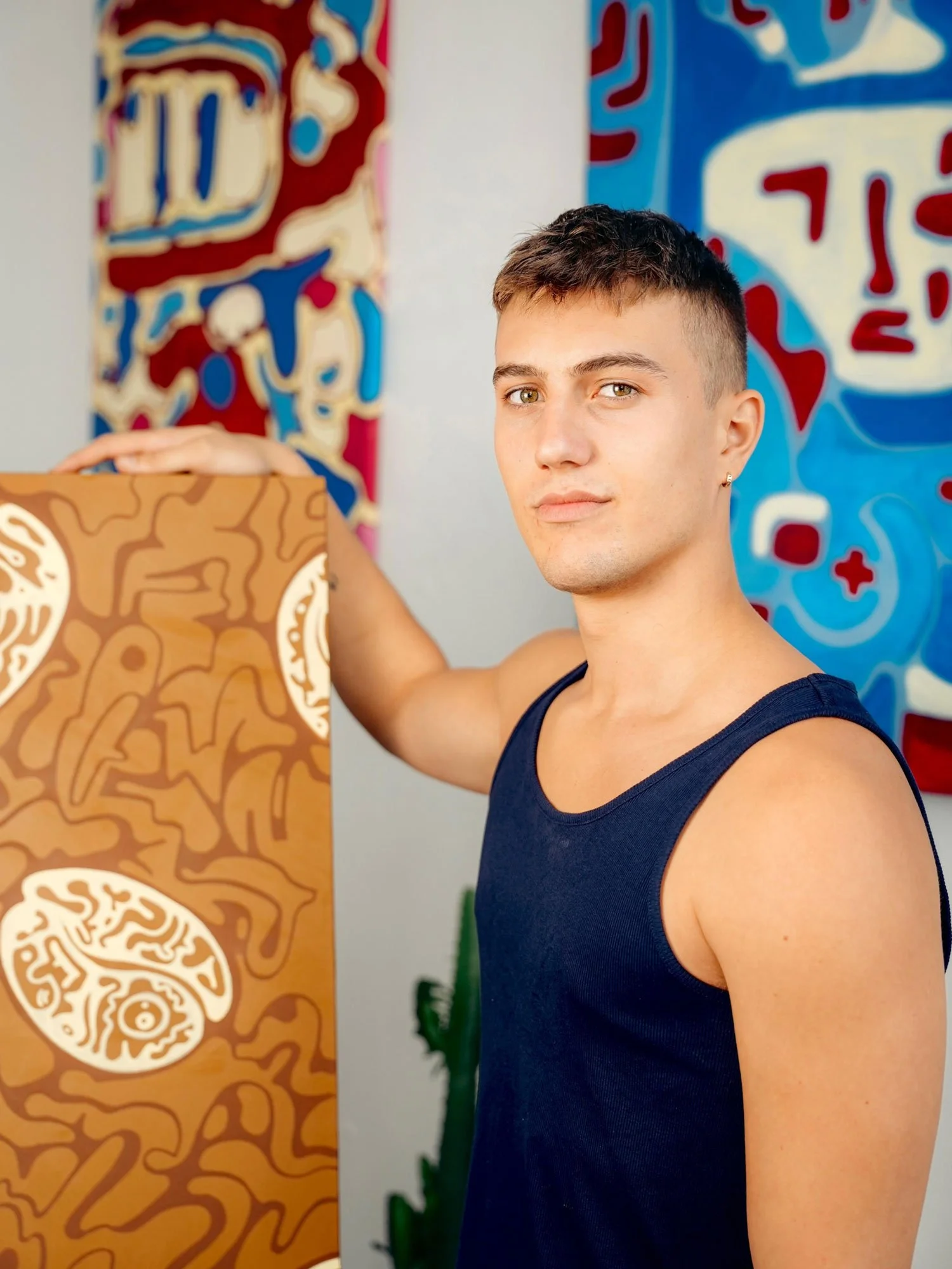 Max grew up in a family of artists in Graz, but only in the past few years discovered painting as his own form of expression. Now living in Vienna, he works mainly with pop art and comic-inspired elements, using strong outlines and vibrant colors to give his ideas a lively, playful edge. His art reflects his curiosity and imagination, often blending humor with story-like qualities. Beyond his own practice, Max co-runs a gallery and clubhouse that has become a meeting point for young people and creatives in Vienna. He continues to expand his journey through exhibitions, collaborations, and projects such as creating label designs for GAVIE Gin.